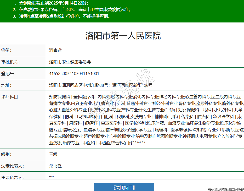 省份:河南省审批机关:洛阳市卫生健康委员会登记号:41652500341030411A1001地址:洛阳市瀍河回族区中州东路88号;瀍河回族区新街156号诊疗科目:预防保健科 | 全科医疗科 | 内科;呼吸内科专业;消化内科专业;神经内科专业;心血管内科专业;血液内科专业;肾病学专业;内分泌专业;老年病专业 | 外科;普通外科专业;神经外科专业;骨科专业;泌尿外科专业;胸外科专业;心脏大血管外科专业 | 妇产科;妇科专业;产科专业;计划生育专业(门诊) | 妇女保健科 | 儿科 | 小儿外科 | 儿童保健科 | 眼科 | 耳鼻咽喉科 | 口腔科 | 皮肤科;皮肤病专业 | 精神科(门诊) | 传染科 | 肿瘤科 | 急诊医学科 | 康复医学科 | 麻醉科 | 疼痛科 | 重症医学科 | 医学检验科;临床体液、血液专业;临床微生物学专业;临床化学检验专业;临床免疫、血清学专业;临床细胞分子遗传学专业 | 病理科 | 医学影像科;X线诊断专业;CT诊断专业;磁共振成像诊断专业;超声诊断专业;心电诊断专业;脑电及脑血流图诊断专业;神经肌肉电图专业;介入放射学专业;放射治疗专业 | 中医科 | 中西医结合科(门诊)******级别:三级法定代表人:常书锋主要负责人:***执业许可证有效期:2025/08/11 -至- 2033/04/07 -