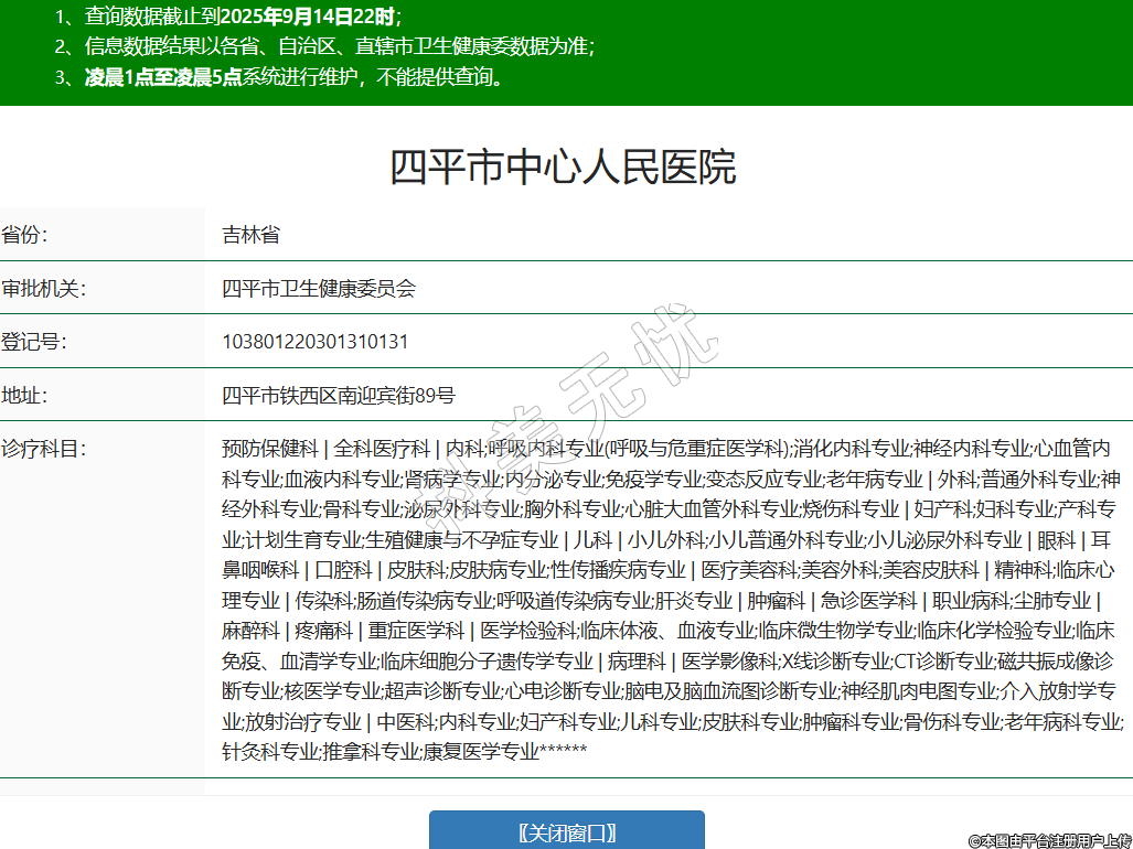 省份:吉林省审批机关:四平市卫生健康委员会登记号:103801220301310131地址:四平市铁西区南迎宾街89号诊疗科目:预防保健科 | 全科医疗科 | 内科;呼吸内科专业(呼吸与危重症医学科);消化内科专业;神经内科专业;心血管内科专业;血液内科专业;肾病学专业;内分泌专业;免疫学专业;变态反应专业;老年病专业 | 外科;普通外科专业;神经外科专业;骨科专业;泌尿外科专业;胸外科专业;心脏大血管外科专业;烧伤科专业 | 妇产科;妇科专业;产科专业;计划生育专业;生殖健康与不孕症专业 | 儿科 | 小儿外科;小儿普通外科专业;小儿泌尿外科专业 | 眼科 | 耳鼻咽喉科 | 口腔科 | 皮肤科;皮肤病专业;性传播疾病专业 | 医疗美容科;美容外科;美容皮肤科 | 精神科;临床心理专业 | 传染科;肠道传染病专业;呼吸道传染病专业;肝炎专业 | 肿瘤科 | 急诊医学科 | 职业病科;尘肺专业 | 麻醉科 | 疼痛科 | 重症医学科 | 医学检验科;临床体液、血液专业;临床微生物学专业;临床化学检验专业;临床免疫、血清学专业;临床细胞分子遗传学专业 | 病理科 | 医学影像科;X线诊断专业;CT诊断专业;磁共振成像诊断专业;核医学专业;超声诊断专业;心电诊断专业;脑电及脑血流图诊断专业;神经肌肉电图专业;介入放射学专业;放射治疗专业 | 中医科;内科专业;妇产科专业;儿科专业;皮肤科专业;肿瘤科专业;骨伤科专业;老年病科专业;针灸科专业;推拿科专业;康复医学专业******级别:三级法定代表人:张宇主要负责人:张宇执业许可证有效期:2025/03/20 -至- 2028/03/20 -