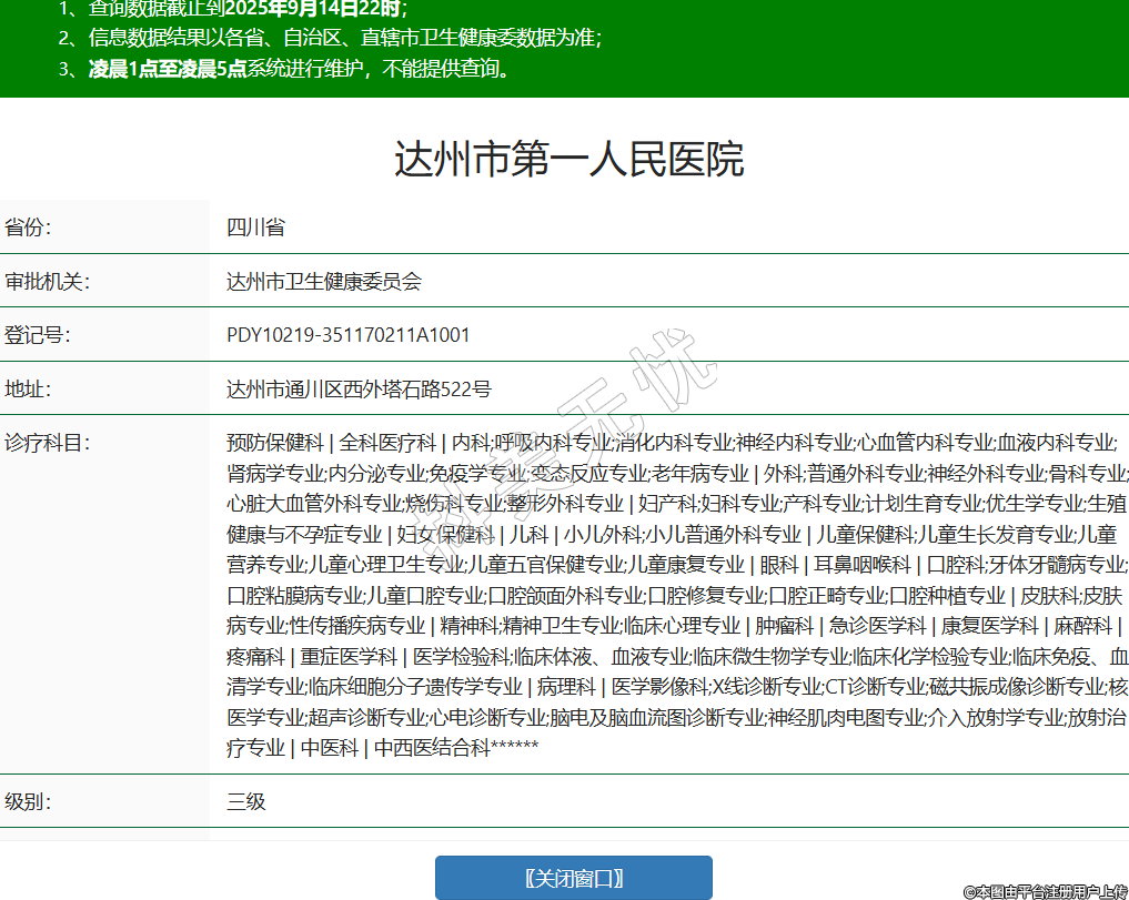 省份:四川省审批机关:达州市卫生健康委员会登记号:PDY10219-351170211A1001地址:达州市通川区西外塔石路522号诊疗科目:预防保健科 | 全科医疗科 | 内科;呼吸内科专业;消化内科专业;神经内科专业;心血管内科专业;血液内科专业;肾病学专业;内分泌专业;免疫学专业;变态反应专业;老年病专业 | 外科;普通外科专业;神经外科专业;骨科专业;心脏大血管外科专业;烧伤科专业;整形外科专业 | 妇产科;妇科专业;产科专业;计划生育专业;优生学专业;生殖健康与不孕症专业 | 妇女保健科 | 儿科 | 小儿外科;小儿普通外科专业 | 儿童保健科;儿童生长发育专业;儿童营养专业;儿童心理卫生专业;儿童五官保健专业;儿童康复专业 | 眼科 | 耳鼻咽喉科 | 口腔科;牙体牙髓病专业;口腔粘膜病专业;儿童口腔专业;口腔颌面外科专业;口腔修复专业;口腔正畸专业;口腔种植专业 | 皮肤科;皮肤病专业;性传播疾病专业 | 精神科;精神卫生专业;临床心理专业 | 肿瘤科 | 急诊医学科 | 康复医学科 | 麻醉科 | 疼痛科 | 重症医学科 | 医学检验科;临床体液、血液专业;临床微生物学专业;临床化学检验专业;临床免疫、血清学专业;临床细胞分子遗传学专业 | 病理科 | 医学影像科;X线诊断专业;CT诊断专业;磁共振成像诊断专业;核医学专业;超声诊断专业;心电诊断专业;脑电及脑血流图诊断专业;神经肌肉电图专业;介入放射学专业;放射治疗专业 | 中医科 | 中西医结合科******级别:三级法定代表人:祝彪主要负责人:祝彪执业许可证有效期:2024/04/30 -至- 2039/04/29 -