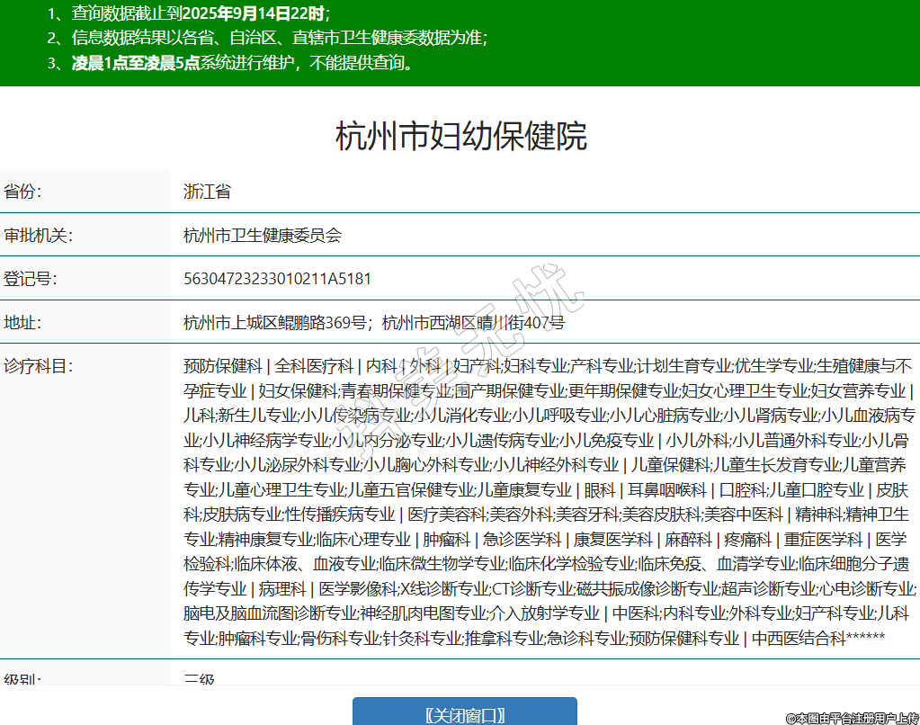省份:浙江省审批机关:杭州市卫生健康委员会登记号:56304723233010211A5181地址:杭州市上城区鲲鹏路369号;杭州市西湖区晴川街407号诊疗科目:预防保健科 | 全科医疗科 | 内科 | 外科 | 妇产科;妇科专业;产科专业;计划生育专业;优生学专业;生殖健康与不孕症专业 | 妇女保健科;青春期保健专业;围产期保健专业;更年期保健专业;妇女心理卫生专业;妇女营养专业 | 儿科;新生儿专业;小儿传染病专业;小儿消化专业;小儿呼吸专业;小儿心脏病专业;小儿肾病专业;小儿血液病专业;小儿神经病学专业;小儿内分泌专业;小儿遗传病专业;小儿免疫专业 | 小儿外科;小儿普通外科专业;小儿骨科专业;小儿泌尿外科专业;小儿胸心外科专业;小儿神经外科专业 | 儿童保健科;儿童生长发育专业;儿童营养专业;儿童心理卫生专业;儿童五官保健专业;儿童康复专业 | 眼科 | 耳鼻咽喉科 | 口腔科;儿童口腔专业 | 皮肤科;皮肤病专业;性传播疾病专业 | 医疗美容科;美容外科;美容牙科;美容皮肤科;美容中医科 | 精神科;精神卫生专业;精神康复专业;临床心理专业 | 肿瘤科 | 急诊医学科 | 康复医学科 | 麻醉科 | 疼痛科 | 重症医学科 | 医学检验科;临床体液、血液专业;临床微生物学专业;临床化学检验专业;临床免疫、血清学专业;临床细胞分子遗传学专业 | 病理科 | 医学影像科;X线诊断专业;CT诊断专业;磁共振成像诊断专业;超声诊断专业;心电诊断专业;脑电及脑血流图诊断专业;神经肌肉电图专业;介入放射学专业 | 中医科;内科专业;外科专业;妇产科专业;儿科专业;肿瘤科专业;骨伤科专业;针灸科专业;推拿科专业;急诊科专业;预防保健科专业 | 中西医结合科******级别:三级法定代表人:李香娟主要负责人:李香娟执业许可证有效期:2025/08/11 -至- 2029/10/19 -