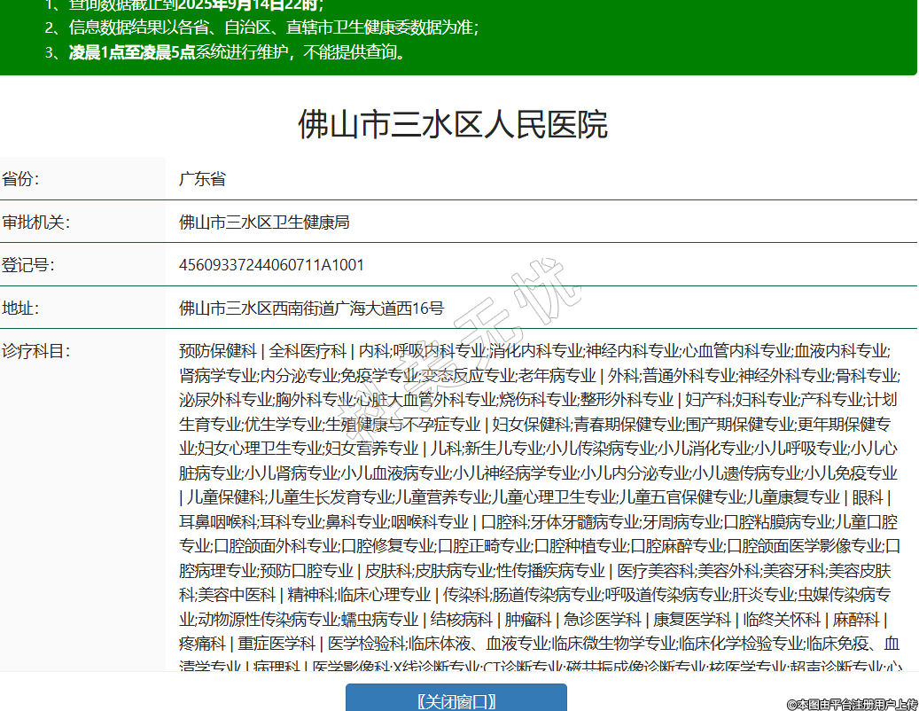省份:广东省审批机关:佛山市三水区卫生健康局登记号:45609337244060711A1001地址:佛山市三水区西南街道广海大道西16号诊疗科目:预防保健科 | 全科医疗科 | 内科;呼吸内科专业;消化内科专业;神经内科专业;心血管内科专业;血液内科专业;肾病学专业;内分泌专业;免疫学专业;变态反应专业;老年病专业 | 外科;普通外科专业;神经外科专业;骨科专业;泌尿外科专业;胸外科专业;心脏大血管外科专业;烧伤科专业;整形外科专业 | 妇产科;妇科专业;产科专业;计划生育专业;优生学专业;生殖健康与不孕症专业 | 妇女保健科;青春期保健专业;围产期保健专业;更年期保健专业;妇女心理卫生专业;妇女营养专业 | 儿科;新生儿专业;小儿传染病专业;小儿消化专业;小儿呼吸专业;小儿心脏病专业;小儿肾病专业;小儿血液病专业;小儿神经病学专业;小儿内分泌专业;小儿遗传病专业;小儿免疫专业 | 儿童保健科;儿童生长发育专业;儿童营养专业;儿童心理卫生专业;儿童五官保健专业;儿童康复专业 | 眼科 | 耳鼻咽喉科;耳科专业;鼻科专业;咽喉科专业 | 口腔科;牙体牙髓病专业;牙周病专业;口腔粘膜病专业;儿童口腔专业;口腔颌面外科专业;口腔修复专业;口腔正畸专业;口腔种植专业;口腔麻醉专业;口腔颌面医学影像专业;口腔病理专业;预防口腔专业 | 皮肤科;皮肤病专业;性传播疾病专业 | 医疗美容科;美容外科;美容牙科;美容皮肤科;美容中医科 | 精神科;临床心理专业 | 传染科;肠道传染病专业;呼吸道传染病专业;肝炎专业;虫媒传染病专业;动物源性传染病专业;蠕虫病专业 | 结核病科 | 肿瘤科 | 急诊医学科 | 康复医学科 | 临终关怀科 | 麻醉科 | 疼痛科 | 重症医学科 | 医学检验科;临床体液、血液专业;临床微生物学专业;临床化学检验专业;临床免疫、血清学专业 | 病理科 | 医学影像科;X线诊断专业;CT诊断专业;磁共振成像诊断专业;核医学专业;超声诊断专业;心电诊断专业;脑电及脑血流图诊断专业;神经肌肉电图专业;介入放射学专业 | 中医科;内科专业;儿科专业;骨伤科专业;肛肠科专业;针灸科专业;推拿科专业;康复医学专业;急诊科专业;预防保健科专业 | 中西医结合科******级别:三级法定代表人:王沂峰主要负责人:王沂峰执业许可证有效期:2025/07/17 -至- 2034/02/01 -