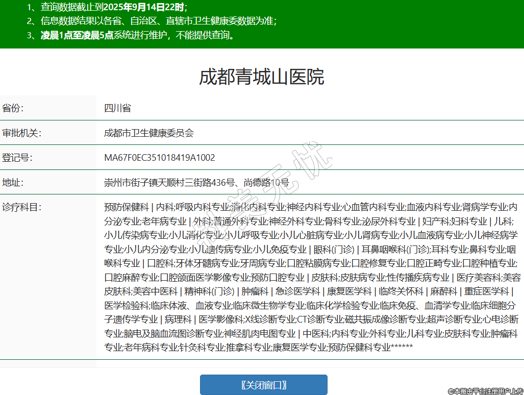 省份:四川省审批机关:成都市卫生健康委员会登记号:MA67F0EC351018419A1002地址:崇州市街子镇天顺村三街路436号、尚德路10号诊疗科目:预防保健科 | 内科;呼吸内科专业;消化内科专业;神经内科专业;心血管内科专业;血液内科专业;肾病学专业;内分泌专业;老年病专业 | 外科;普通外科专业;神经外科专业;骨科专业;泌尿外科专业 | 妇产科;妇科专业 | 儿科;小儿传染病专业;小儿消化专业;小儿呼吸专业;小儿心脏病专业;小儿肾病专业;小儿血液病专业;小儿神经病学专业;小儿内分泌专业;小儿遗传病专业;小儿免疫专业 | 眼科(门诊) | 耳鼻咽喉科(门诊);耳科专业;鼻科专业;咽喉科专业 | 口腔科;牙体牙髓病专业;牙周病专业;口腔粘膜病专业;口腔修复专业;口腔正畸专业;口腔种植专业;口腔麻醉专业;口腔颌面医学影像专业;预防口腔专业 | 皮肤科;皮肤病专业;性传播疾病专业 | 医疗美容科;美容皮肤科;美容中医科 | 精神科(门诊) | 肿瘤科 | 急诊医学科 | 康复医学科 | 临终关怀科 | 麻醉科 | 重症医学科 | 医学检验科;临床体液、血液专业;临床微生物学专业;临床化学检验专业;临床免疫、血清学专业;临床细胞分子遗传学专业 | 病理科 | 医学影像科;X线诊断专业;CT诊断专业;磁共振成像诊断专业;超声诊断专业;心电诊断专业;脑电及脑血流图诊断专业;神经肌肉电图专业 | 中医科;内科专业;外科专业;儿科专业;皮肤科专业;肿瘤科专业;老年病科专业;针灸科专业;推拿科专业;康复医学专业;预防保健科专业******级别:三级法定代表人:李瑶盖主要负责人:张健执业许可证有效期:2021/06/07 -至- 2035/11/08 -