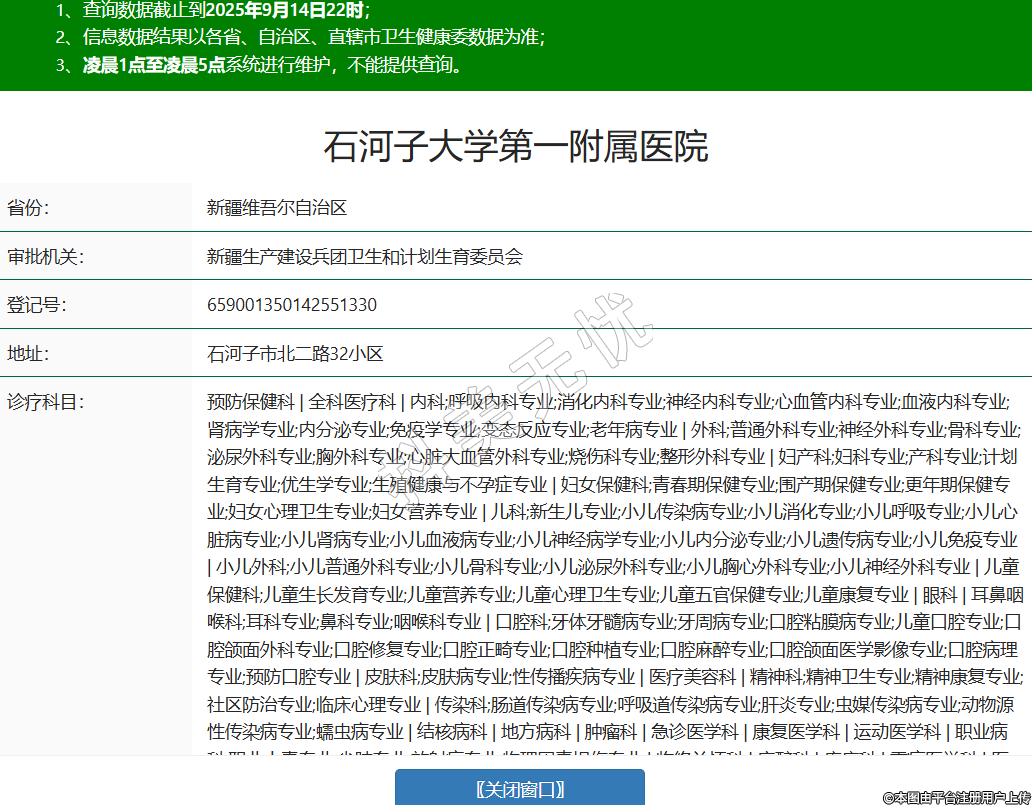 省份:新疆维吾尔自治区审批机关:新疆生产建设兵团卫生和计划生育委员会登记号:659001350142551330地址:石河子市北二路32小区诊疗科目:预防保健科 | 全科医疗科 | 内科;呼吸内科专业;消化内科专业;神经内科专业;心血管内科专业;血液内科专业;肾病学专业;内分泌专业;免疫学专业;变态反应专业;老年病专业 | 外科;普通外科专业;神经外科专业;骨科专业;泌尿外科专业;胸外科专业;心脏大血管外科专业;烧伤科专业;整形外科专业 | 妇产科;妇科专业;产科专业;计划生育专业;优生学专业;生殖健康与不孕症专业 | 妇女保健科;青春期保健专业;围产期保健专业;更年期保健专业;妇女心理卫生专业;妇女营养专业 | 儿科;新生儿专业;小儿传染病专业;小儿消化专业;小儿呼吸专业;小儿心脏病专业;小儿肾病专业;小儿血液病专业;小儿神经病学专业;小儿内分泌专业;小儿遗传病专业;小儿免疫专业 | 小儿外科;小儿普通外科专业;小儿骨科专业;小儿泌尿外科专业;小儿胸心外科专业;小儿神经外科专业 | 儿童保健科;儿童生长发育专业;儿童营养专业;儿童心理卫生专业;儿童五官保健专业;儿童康复专业 | 眼科 | 耳鼻咽喉科;耳科专业;鼻科专业;咽喉科专业 | 口腔科;牙体牙髓病专业;牙周病专业;口腔粘膜病专业;儿童口腔专业;口腔颌面外科专业;口腔修复专业;口腔正畸专业;口腔种植专业;口腔麻醉专业;口腔颌面医学影像专业;口腔病理专业;预防口腔专业 | 皮肤科;皮肤病专业;性传播疾病专业 | 医疗美容科 | 精神科;精神卫生专业;精神康复专业;社区防治专业;临床心理专业 | 传染科;肠道传染病专业;呼吸道传染病专业;肝炎专业;虫媒传染病专业;动物源性传染病专业;蠕虫病专业 | 结核病科 | 地方病科 | 肿瘤科 | 急诊医学科 | 康复医学科 | 运动医学科 | 职业病科;职业中毒专业;尘肺专业;放射病专业;物理因素损伤专业 | 临终关怀科 | 麻醉科 | 疼痛科 | 重症医学科 | 医学检验科;临床体液、血液专业;临床微生物学专业;临床化学检验专业;临床免疫、血清学专业;临床细胞分子遗传学专业 | 病理科 | 医学影像科;X线诊断专业;CT诊断专业;磁共振成像诊断专业;核医学专业;超声诊断专业;心电诊断专业;脑电及脑血流图诊断专业;神经肌肉电图专业;介入放射学专业;放射治疗专业 | 中医科;内科专业;外科专业;妇产科专业;儿科专业;皮肤科专业;肿瘤科专业;肛肠科专业;老年病科专业;针灸科专业;推拿科专业;康复医学专业;预防保健科专业 | 中西医结合科******级别:三级法定代表人:王维山主要负责人:王维山执业许可证有效期:2023/01/20 -至- 2032/06/13 -