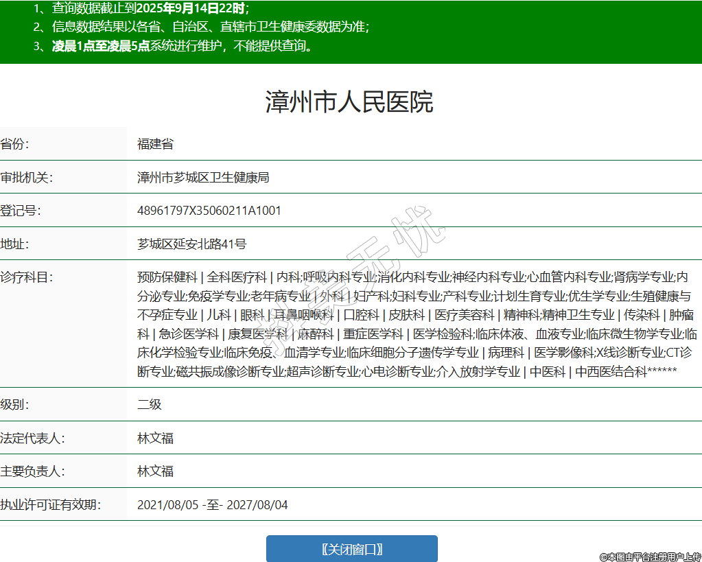 省份:福建省审批机关:漳州市芗城区卫生健康局登记号:48961797X35060211A1001地址:芗城区延安北路41号诊疗科目:预防保健科 | 全科医疗科 | 内科;呼吸内科专业;消化内科专业;神经内科专业;心血管内科专业;肾病学专业;内分泌专业;免疫学专业;老年病专业 | 外科 | 妇产科;妇科专业;产科专业;计划生育专业;优生学专业;生殖健康与不孕症专业 | 儿科 | 眼科 | 耳鼻咽喉科 | 口腔科 | 皮肤科 | 医疗美容科 | 精神科;精神卫生专业 | 传染科 | 肿瘤科 | 急诊医学科 | 康复医学科 | 麻醉科 | 重症医学科 | 医学检验科;临床体液、血液专业;临床微生物学专业;临床化学检验专业;临床免疫、血清学专业;临床细胞分子遗传学专业 | 病理科 | 医学影像科;X线诊断专业;CT诊断专业;磁共振成像诊断专业;超声诊断专业;心电诊断专业;介入放射学专业 | 中医科 | 中西医结合科******级别:二级法定代表人:林文福主要负责人:林文福执业许可证有效期:2021/08/05 -至- 2027/08/04 -