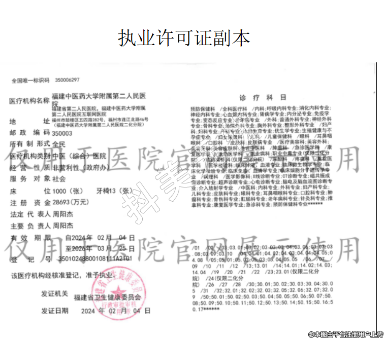 省份:福建省审批机关:福建省卫生健康委员会登记号:35010248800108111A2101地址:福州市鼓楼区五四路282号,福州市连江北路46号(福建中医药大学附属第二人民医院二化分院)诊疗科目:预防保健科 | 全科医疗科 | 内科;呼吸内科专业;消化内科专业;神经内科专业;心血管内科专业;肾病学专业;内分泌专业;免疫学专业;变态反应专业;老年病专业 | 外科;普通外科专业;神经外科专业;骨科专业;泌尿外科专业;胸外科专业;整形外科专业 | 妇产科;妇科专业;产科专业;计划生育专业;优生学专业;生殖健康与不孕症专业 | 妇女保健科 | 儿科 | 儿童保健科 | 眼科 | 耳鼻咽喉科 | 口腔科 | 皮肤科;皮肤病专业 | 医疗美容科;美容外科;美容牙科;美容皮肤科;美容中医科 | 肿瘤科 | 急诊医学科 | 康复医学科 | 运动医学科 | 职业病科;职业中毒专业(仅限二化分院) | 临终关怀科(仅限二化分院) | 麻醉科 | 疼痛科 | 重症医学科 | 医学检验科;临床体液、血液专业;临床微生物学专业;临床化学检验专业;临床免疫、血清学专业;临床细胞分子遗传学专业 | 病理科 | 医学影像科;X线诊断专业;CT诊断专业;磁共振成像诊断专业;超声诊断专业;心电诊断专业;脑电及脑血流图诊断专业;介入放射学专业 | 中医科;内科专业;外科专业;妇产科专业;儿科专业;皮肤科专业;眼科专业;耳鼻咽喉科专业;口腔科专业;肿瘤科专业;骨伤科专业;肛肠科专业;老年病科专业;针灸科专业;推拿科专业;康复医学专业;急诊科专业;预防保健科专业******级别:三级法定代表人:周阳杰主要负责人:周阳杰执业许可证有效期:2025/04/03 -至- 2026/03/25 -