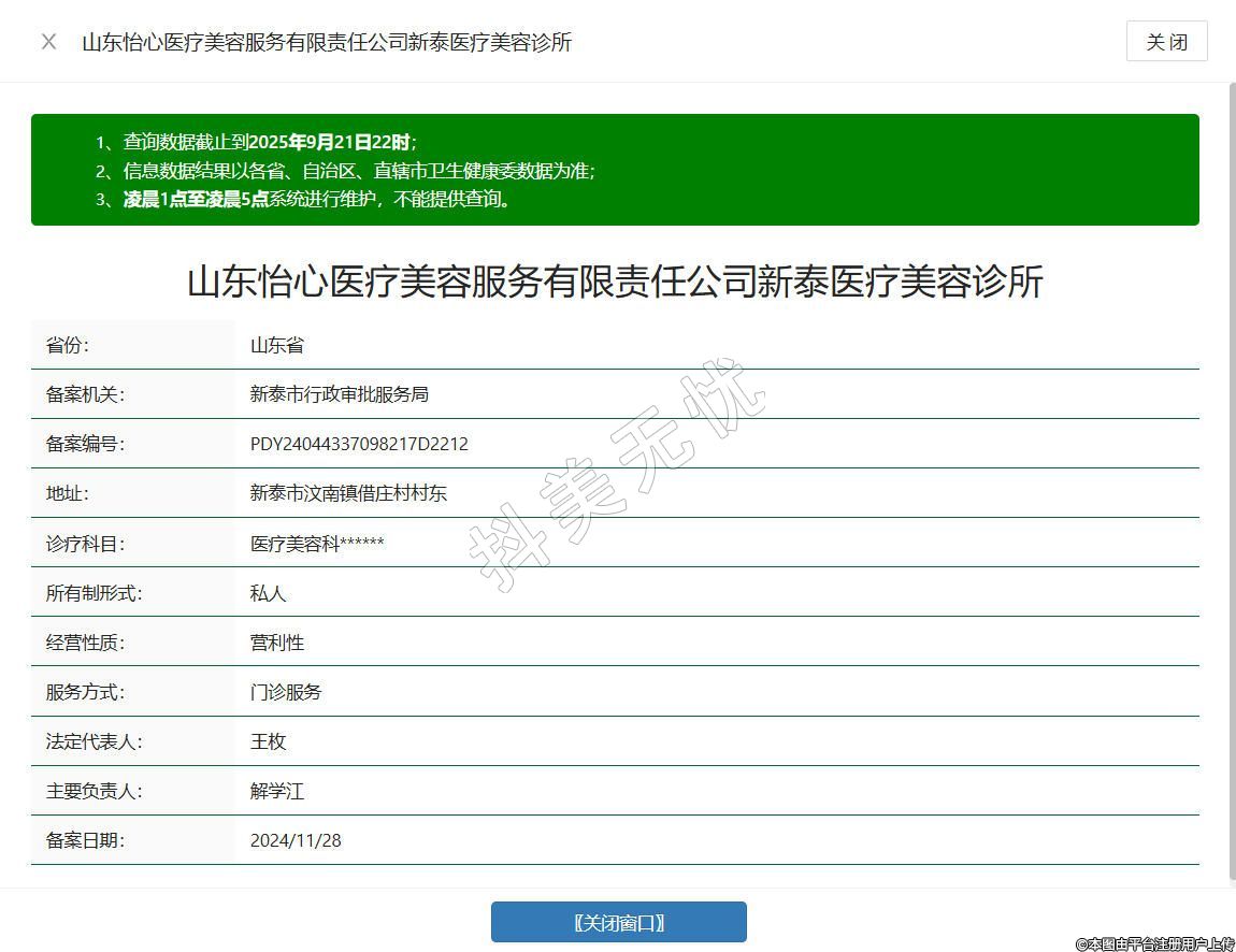 新泰怡心医疗美容诊所成立于2024年,位于山东省泰安市新泰市汶南镇借庄村村东,是经审批的正规医疗美容机构,经营范围涵盖医疗美容服务、生活美容服务等许可项目,秉持合规经营理念,组建专业服务团队,致力于提供规范的医疗美容相关服务。