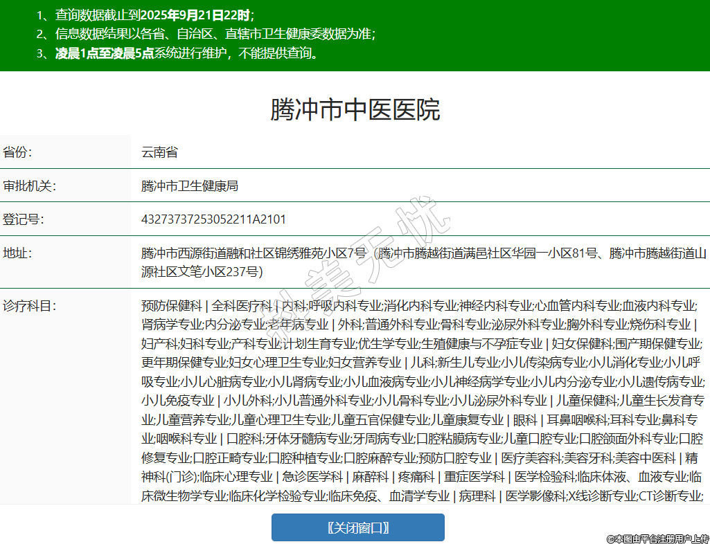 省份:云南省审批机关:腾冲市卫生健康局登记号:43273737253052211A2101地址:腾冲市西源街道融和社区锦绣雅苑小区7号(腾冲市腾越街道满邑社区华园一小区81号、腾冲市腾越街道山源社区文笔小区237号)诊疗科目:预防保健科 | 全科医疗科 | 内科;呼吸内科专业;消化内科专业;神经内科专业;心血管内科专业;血液内科专业;肾病学专业;内分泌专业;老年病专业 | 外科;普通外科专业;骨科专业;泌尿外科专业;胸外科专业;烧伤科专业 | 妇产科;妇科专业;产科专业;计划生育专业;优生学专业;生殖健康与不孕症专业 | 妇女保健科;围产期保健专业;更年期保健专业;妇女心理卫生专业;妇女营养专业 | 儿科;新生儿专业;小儿传染病专业;小儿消化专业;小儿呼吸专业;小儿心脏病专业;小儿肾病专业;小儿血液病专业;小儿神经病学专业;小儿内分泌专业;小儿遗传病专业;小儿免疫专业 | 小儿外科;小儿普通外科专业;小儿骨科专业;小儿泌尿外科专业 | 儿童保健科;儿童生长发育专业;儿童营养专业;儿童心理卫生专业;儿童五官保健专业;儿童康复专业 | 眼科 | 耳鼻咽喉科;耳科专业;鼻科专业;咽喉科专业 | 口腔科;牙体牙髓病专业;牙周病专业;口腔粘膜病专业;儿童口腔专业;口腔颌面外科专业;口腔修复专业;口腔正畸专业;口腔种植专业;口腔麻醉专业;预防口腔专业 | 医疗美容科;美容牙科;美容中医科 | 精神科(门诊);临床心理专业 | 急诊医学科 | 麻醉科 | 疼痛科 | 重症医学科 | 医学检验科;临床体液、血液专业;临床微生物学专业;临床化学检验专业;临床免疫、血清学专业 | 病理科 | 医学影像科;X线诊断专业;CT诊断专业;超声诊断专业;心电诊断专业;脑电及脑血流图诊断专业;介入放射学专业 | 中医科;内科专业;外科专业;妇产科专业;儿科专业;皮肤科专业;眼科专业;耳鼻咽喉科专业;口腔科专业;肿瘤科专业;骨伤科专业;肛肠科专业;老年病科专业;针灸科专业;推拿科专业;康复医学专业;急诊科专业;预防保健科专业(治未病科) | 中西医结合科******级别:三级法定代表人:谢兆明主要负责人:谢兆明执业许可证有效期:2025/05/19 -至- 2034/11/03 -