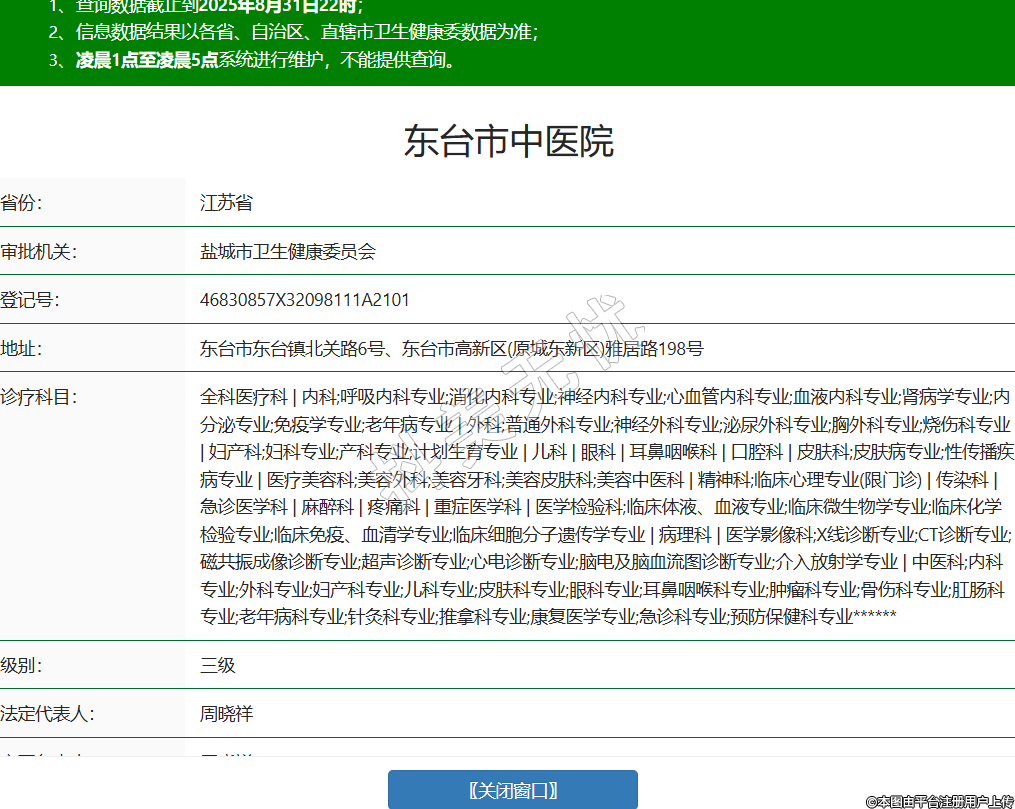 省份:江苏省审批机关:盐城市卫生健康委员会登记号:46830857X32098111A2101地址:东台市东台镇北关路6号、东台市高新区(原城东新区)雅居路198号诊疗科目:全科医疗科 | 内科;呼吸内科专业;消化内科专业;神经内科专业;心血管内科专业;血液内科专业;肾病学专业;内分泌专业;免疫学专业;老年病专业 | 外科;普通外科专业;神经外科专业;泌尿外科专业;胸外科专业;烧伤科专业 | 妇产科;妇科专业;产科专业;计划生育专业 | 儿科 | 眼科 | 耳鼻咽喉科 | 口腔科 | 皮肤科;皮肤病专业;性传播疾病专业 | 医疗美容科;美容外科;美容牙科;美容皮肤科;美容中医科 | 精神科;临床心理专业(限门诊) | 传染科 | 急诊医学科 | 麻醉科 | 疼痛科 | 重症医学科 | 医学检验科;临床体液、血液专业;临床微生物学专业;临床化学检验专业;临床免疫、血清学专业;临床细胞分子遗传学专业 | 病理科 | 医学影像科;X线诊断专业;CT诊断专业;磁共振成像诊断专业;超声诊断专业;心电诊断专业;脑电及脑血流图诊断专业;介入放射学专业 | 中医科;内科专业;外科专业;妇产科专业;儿科专业;皮肤科专业;眼科专业;耳鼻咽喉科专业;肿瘤科专业;骨伤科专业;肛肠科专业;老年病科专业;针灸科专业;推拿科专业;康复医学专业;急诊科专业;预防保健科专业******级别:三级法定代表人:周晓祥主要负责人:周晓祥执业许可证有效期:2020/04/23 -至- 2035/04/22 -