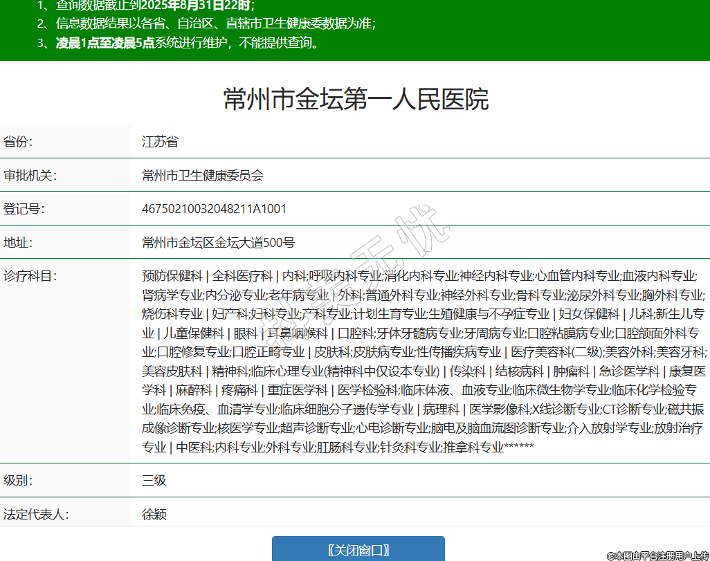 省份:江苏省审批机关:常州市卫生健康委员会登记号:46750210032048211A1001地址:常州市金坛区金坛大道500号诊疗科目:预防保健科 | 全科医疗科 | 内科;呼吸内科专业;消化内科专业;神经内科专业;心血管内科专业;血液内科专业;肾病学专业;内分泌专业;老年病专业 | 外科;普通外科专业;神经外科专业;骨科专业;泌尿外科专业;胸外科专业;烧伤科专业 | 妇产科;妇科专业;产科专业;计划生育专业;生殖健康与不孕症专业 | 妇女保健科 | 儿科;新生儿专业 | 儿童保健科 | 眼科 | 耳鼻咽喉科 | 口腔科;牙体牙髓病专业;牙周病专业;口腔粘膜病专业;口腔颌面外科专业;口腔修复专业;口腔正畸专业 | 皮肤科;皮肤病专业;性传播疾病专业 | 医疗美容科(二级);美容外科;美容牙科;美容皮肤科 | 精神科;临床心理专业(精神科中仅设本专业) | 传染科 | 结核病科 | 肿瘤科 | 急诊医学科 | 康复医学科 | 麻醉科 | 疼痛科 | 重症医学科 | 医学检验科;临床体液、血液专业;临床微生物学专业;临床化学检验专业;临床免疫、血清学专业;临床细胞分子遗传学专业 | 病理科 | 医学影像科;X线诊断专业;CT诊断专业;磁共振成像诊断专业;核医学专业;超声诊断专业;心电诊断专业;脑电及脑血流图诊断专业;介入放射学专业;放射治疗专业 | 中医科;内科专业;外科专业;肛肠科专业;针灸科专业;推拿科专业******级别:三级法定代表人:徐颖主要负责人:徐颖执业许可证有效期:2024/01/18 -至- 2034/12/24 -