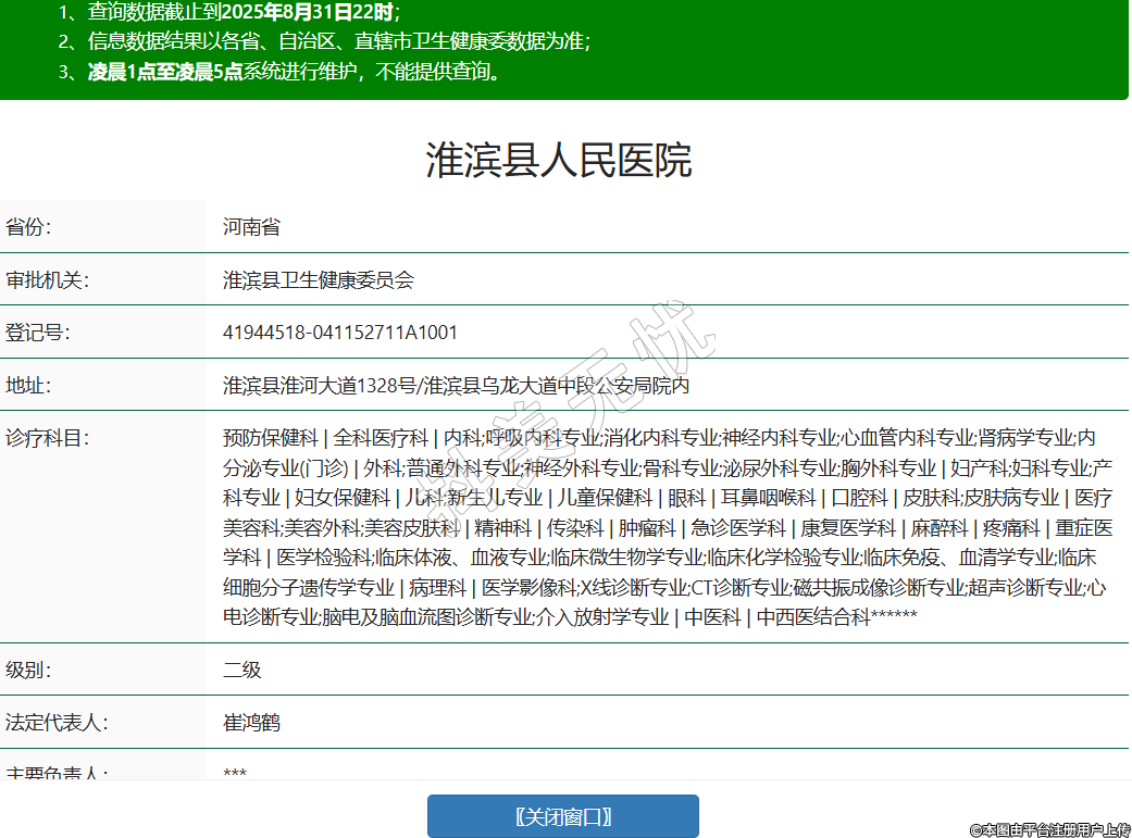 省份:河南省审批机关:淮滨县卫生健康委员会登记号:41944518-041152711A1001地址:淮滨县淮河大道1328号/淮滨县乌龙大道中段公安局院内诊疗科目:预防保健科 | 全科医疗科 | 内科;呼吸内科专业;消化内科专业;神经内科专业;心血管内科专业;肾病学专业;内分泌专业(门诊) | 外科;普通外科专业;神经外科专业;骨科专业;泌尿外科专业;胸外科专业 | 妇产科;妇科专业;产科专业 | 妇女保健科 | 儿科;新生儿专业 | 儿童保健科 | 眼科 | 耳鼻咽喉科 | 口腔科 | 皮肤科;皮肤病专业 | 医疗美容科;美容外科;美容皮肤科 | 精神科 | 传染科 | 肿瘤科 | 急诊医学科 | 康复医学科 | 麻醉科 | 疼痛科 | 重症医学科 | 医学检验科;临床体液、血液专业;临床微生物学专业;临床化学检验专业;临床免疫、血清学专业;临床细胞分子遗传学专业 | 病理科 | 医学影像科;X线诊断专业;CT诊断专业;磁共振成像诊断专业;超声诊断专业;心电诊断专业;脑电及脑血流图诊断专业;介入放射学专业 | 中医科 | 中西医结合科******级别:二级法定代表人:崔鸿鹤主要负责人:***执业许可证有效期:2024/02/20 -至- 2030/05/15 -