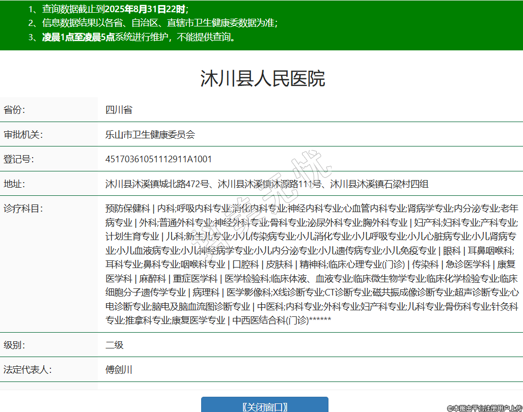 省份:四川省审批机关:乐山市卫生健康委员会登记号:45170361051112911A1001地址:沐川县沐溪镇城北路472号、沐川县沐溪镇沐源路111号、沐川县沐溪镇石梁村四组诊疗科目:预防保健科 | 内科;呼吸内科专业;消化内科专业;神经内科专业;心血管内科专业;肾病学专业;内分泌专业;老年病专业 | 外科;普通外科专业;神经外科专业;骨科专业;泌尿外科专业;胸外科专业 | 妇产科;妇科专业;产科专业;计划生育专业 | 儿科;新生儿专业;小儿传染病专业;小儿消化专业;小儿呼吸专业;小儿心脏病专业;小儿肾病专业;小儿血液病专业;小儿神经病学专业;小儿内分泌专业;小儿遗传病专业;小儿免疫专业 | 眼科 | 耳鼻咽喉科;耳科专业;鼻科专业;咽喉科专业 | 口腔科 | 皮肤科 | 精神科;临床心理专业(门诊) | 传染科 | 急诊医学科 | 康复医学科 | 麻醉科 | 重症医学科 | 医学检验科;临床体液、血液专业;临床微生物学专业;临床化学检验专业;临床细胞分子遗传学专业 | 病理科 | 医学影像科;X线诊断专业;CT诊断专业;磁共振成像诊断专业;超声诊断专业;心电诊断专业;脑电及脑血流图诊断专业 | 中医科;内科专业;外科专业;妇产科专业;儿科专业;骨伤科专业;针灸科专业;推拿科专业;康复医学专业 | 中西医结合科(门诊)******级别:二级法定代表人:傅剑川主要负责人:傅剑川执业许可证有效期:2023/08/10 -至- 2026/12/19 -
