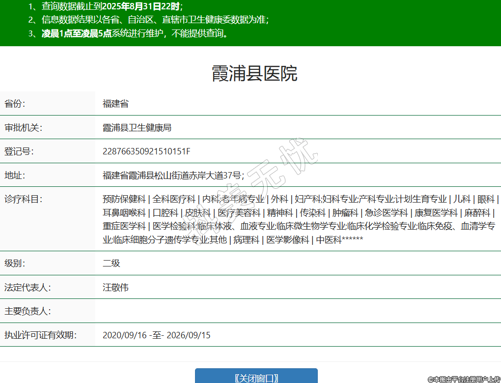 省份:福建省审批机关:霞浦县卫生健康局登记号:228766350921510151F地址:福建省霞浦县松山街道赤岸大道37号;诊疗科目:预防保健科 | 全科医疗科 | 内科;老年病专业 | 外科 | 妇产科;妇科专业;产科专业;计划生育专业 | 儿科 | 眼科 | 耳鼻咽喉科 | 口腔科 | 皮肤科 | 医疗美容科 | 精神科 | 传染科 | 肿瘤科 | 急诊医学科 | 康复医学科 | 麻醉科 | 重症医学科 | 医学检验科;临床体液、血液专业;临床微生物学专业;临床化学检验专业;临床免疫、血清学专业;临床细胞分子遗传学专业;其他 | 病理科 | 医学影像科 | 中医科******级别:二级法定代表人:汪敬伟主要负责人:执业许可证有效期:2020/09/16 -至- 2026/09/15 -