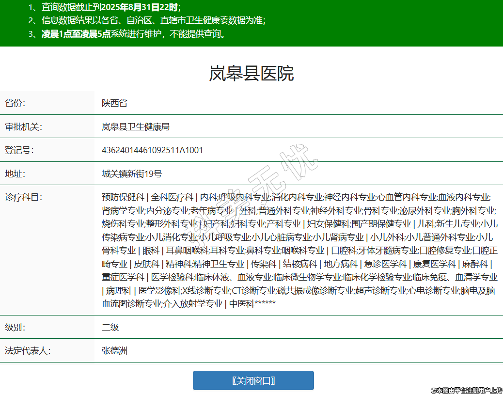 省份:陕西省审批机关:岚皋县卫生健康局登记号:43624014461092511A1001地址:城关镇新街19号诊疗科目:预防保健科 | 全科医疗科 | 内科;呼吸内科专业;消化内科专业;神经内科专业;心血管内科专业;血液内科专业;肾病学专业;内分泌专业;老年病专业 | 外科;普通外科专业;神经外科专业;骨科专业;泌尿外科专业;胸外科专业;烧伤科专业;整形外科专业 | 妇产科;妇科专业;产科专业 | 妇女保健科;围产期保健专业 | 儿科;新生儿专业;小儿传染病专业;小儿消化专业;小儿呼吸专业;小儿心脏病专业;小儿肾病专业 | 小儿外科;小儿普通外科专业;小儿骨科专业 | 眼科 | 耳鼻咽喉科;耳科专业;鼻科专业;咽喉科专业 | 口腔科;牙体牙髓病专业;口腔修复专业;口腔正畸专业 | 皮肤科 | 精神科;精神卫生专业 | 传染科 | 结核病科 | 地方病科 | 急诊医学科 | 康复医学科 | 麻醉科 | 重症医学科 | 医学检验科;临床体液、血液专业;临床微生物学专业;临床化学检验专业;临床免疫、血清学专业 | 病理科 | 医学影像科;X线诊断专业;CT诊断专业;磁共振成像诊断专业;超声诊断专业;心电诊断专业;脑电及脑血流图诊断专业;介入放射学专业 | 中医科******级别:二级法定代表人:张德洲主要负责人:张德洲执业许可证有效期:2025/07/02 -至- 2025/11/23 -