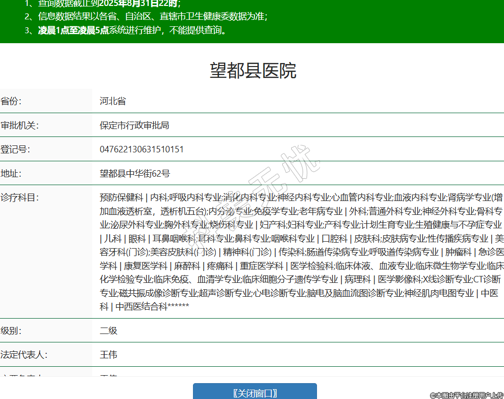 省份:河北省审批机关:保定市行政审批局登记号:047622130631510151地址:望都县中华街62号诊疗科目:预防保健科 | 内科;呼吸内科专业;消化内科专业;神经内科专业;心血管内科专业;血液内科专业;肾病学专业(增加血液透析室,透析机五台);内分泌专业;免疫学专业;老年病专业 | 外科;普通外科专业;神经外科专业;骨科专业;泌尿外科专业;胸外科专业;烧伤科专业 | 妇产科;妇科专业;产科专业;计划生育专业;生殖健康与不孕症专业 | 儿科 | 眼科 | 耳鼻咽喉科;耳科专业;鼻科专业;咽喉科专业 | 口腔科 | 皮肤科;皮肤病专业;性传播疾病专业 | 美容牙科(门诊);美容皮肤科(门诊) | 精神科(门诊) | 传染科;肠道传染病专业;呼吸道传染病专业 | 肿瘤科 | 急诊医学科 | 康复医学科 | 麻醉科 | 疼痛科 | 重症医学科 | 医学检验科;临床体液、血液专业;临床微生物学专业;临床化学检验专业;临床免疫、血清学专业;临床细胞分子遗传学专业 | 病理科 | 医学影像科;X线诊断专业;CT诊断专业;磁共振成像诊断专业;超声诊断专业;心电诊断专业;脑电及脑血流图诊断专业;神经肌肉电图专业 | 中医科 | 中西医结合科******级别:二级法定代表人:王伟主要负责人:王伟执业许可证有效期:2023/07/01 -至- 2038/06/30 -