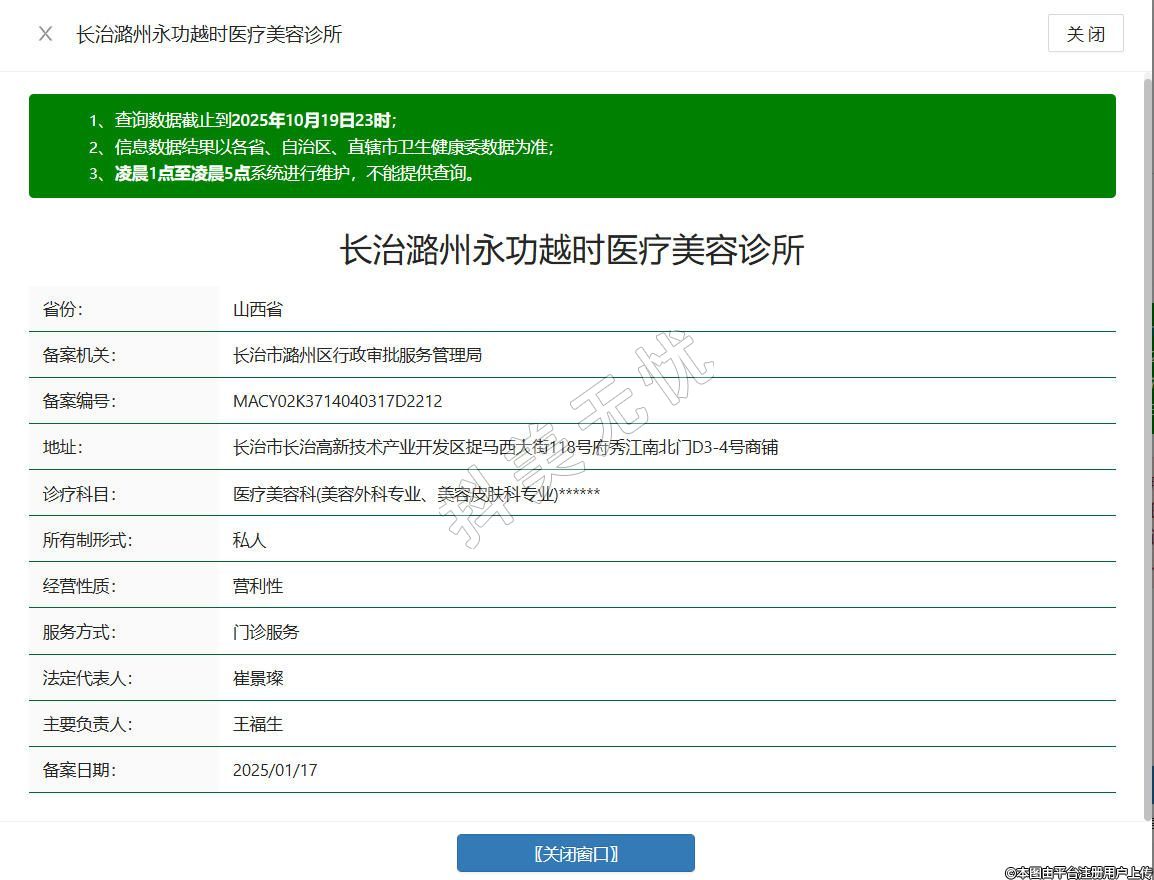 长治永功越时医疗美容诊所成立于2023年,位于山西省长治市长治高新技术产业开发区捉马西大街118号府秀江南北门D3-4号商铺,是经长治市潞州区行政审批服务管理局审批成立的正规医疗美容机构,配备精良医疗设备与完善消毒措施,诊疗范围涵盖医疗美容科(美容外科、美容皮肤科),包含眼鼻整形、面部年轻化、微整形、皮肤美容等项目,秉持规范医疗理念保障就诊体验。