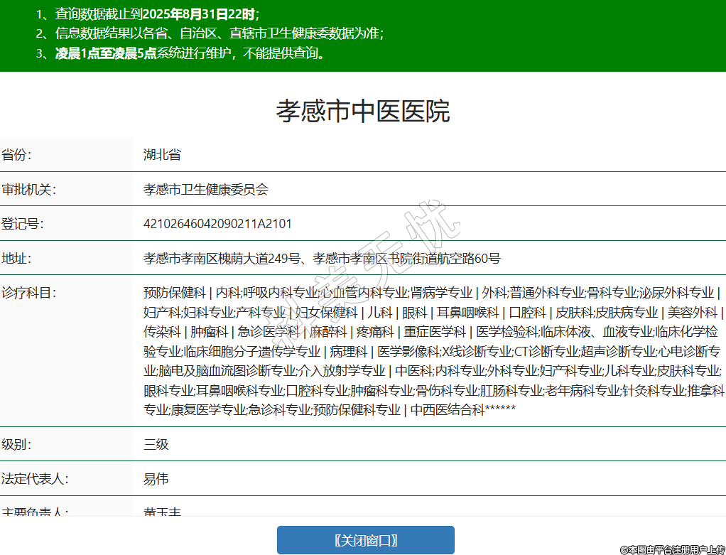 省份:湖北省审批机关:孝感市卫生健康委员会登记号:42102646042090211A2101地址:孝感市孝南区槐荫大道249号、孝感市孝南区书院街道航空路60号诊疗科目:预防保健科 | 内科;呼吸内科专业;心血管内科专业;肾病学专业 | 外科;普通外科专业;骨科专业;泌尿外科专业 | 妇产科;妇科专业;产科专业 | 妇女保健科 | 儿科 | 眼科 | 耳鼻咽喉科 | 口腔科 | 皮肤科;皮肤病专业 | 美容外科 | 传染科 | 肿瘤科 | 急诊医学科 | 麻醉科 | 疼痛科 | 重症医学科 | 医学检验科;临床体液、血液专业;临床化学检验专业;临床细胞分子遗传学专业 | 病理科 | 医学影像科;X线诊断专业;CT诊断专业;超声诊断专业;心电诊断专业;脑电及脑血流图诊断专业;介入放射学专业 | 中医科;内科专业;外科专业;妇产科专业;儿科专业;皮肤科专业;眼科专业;耳鼻咽喉科专业;口腔科专业;肿瘤科专业;骨伤科专业;肛肠科专业;老年病科专业;针灸科专业;推拿科专业;康复医学专业;急诊科专业;预防保健科专业 | 中西医结合科******级别:三级法定代表人:易伟主要负责人:黄玉丰执业许可证有效期:2016/10/20 -至- 2031/10/19 -
