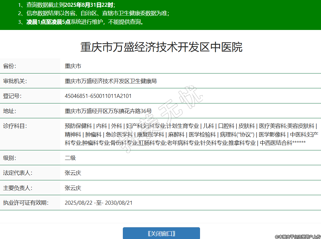 省份:重庆市审批机关:重庆市万盛经济技术开发区卫生健康局登记号:45046851-650011011A2101地址:重庆市万盛经开区万东镇花卉路36号诊疗科目:预防保健科 | 内科 | 外科 | 妇产科;妇科专业;计划生育专业 | 儿科 | 口腔科 | 皮肤科 | 医疗美容科;美容皮肤科 | 精神科 | 肿瘤科 | 急诊医学科 | 康复医学科 | 麻醉科 | 医学检验科 | 病理科("协议”) | 医学影像科 | 中医科;妇产科专业;肿瘤科专业;骨伤科专业;肛肠科专业;老年病科专业;针灸科专业;推拿科专业 | 中西医结合科******级别:二级法定代表人:张云庆主要负责人:张云庆执业许可证有效期:2025/08/22 -至- 2030/08/21 -