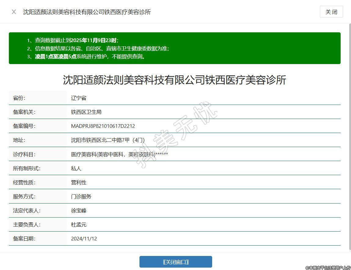 沈阳适颜法则医疗美容诊所成立于2024年,位于沈阳市铁西区北二中路7甲(4门),是持有《医疗机构执业许可证》的正规医美机构,秉持 “科学塑美,自然共生” 理念,具备丰富从业经验的医师,涵盖美容外科、美容皮肤科等诊疗领域,开展眼部塑形、面部抗衰、皮肤护理等项目,引入规范认证的设备与技术,以专业技术与贴心服务,助力爱美人士挖掘自身魅力,实现舒适变美体验。