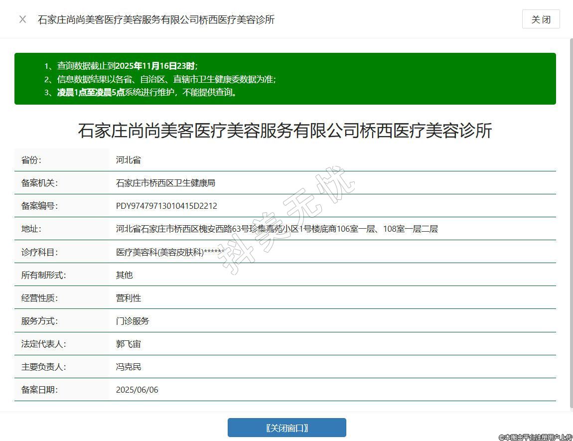 石家庄尚尚美客医疗美容诊所成立于2025年,位于河北省石家庄市桥西区槐安西路63号珍集嘉苑小区1号楼底商106室一层、108室一层二层,是经相关部门备案批准的营利性医疗机构,现处于合法存续状态,科室为医疗美容科(美容皮肤科),专注提供合规范围内的医疗美容服务,始终坚守医疗本质,注重服务流程的规范性与专业性,致力于为有需求的顾客提供符合医疗标准的美容服务体验。