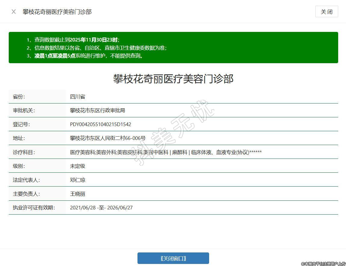 攀枝花奇丽医疗美容门诊部成立于2014年,坐落于四川省攀枝花市东区人民街二村66-006号,是经相关主管部门批准设立的合规医疗美容机构,持有完整的医疗机构执业许可及项目备案资质,汇聚具备正规执业资质与丰富临床经验的专业医师团队,诊疗范围涵盖眼部整形、鼻部整形、面部微整形、皮肤美容、毛发移植等合规医美项目,严格遵循医疗规范流程,为求美者提供规范、安心的医疗美容服务,致力于满足大众对美的合理诉求。