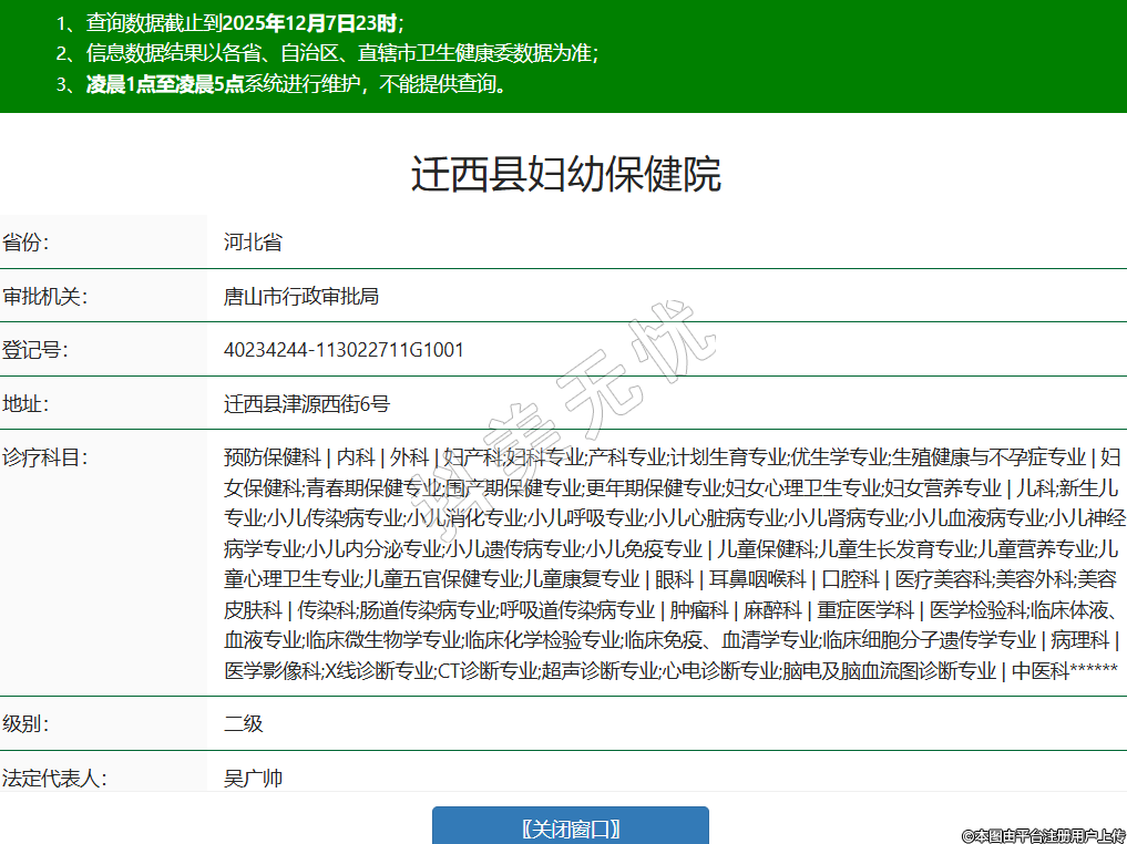 省份:河北省审批机关:唐山市行政审批局登记号:40234244-113022711G1001地址:迁西县津源西街6号诊疗科目:预防保健科 | 内科 | 外科 | 妇产科;妇科专业;产科专业;计划生育专业;优生学专业;生殖健康与不孕症专业 | 妇女保健科;青春期保健专业;围产期保健专业;更年期保健专业;妇女心理卫生专业;妇女营养专业 | 儿科;新生儿专业;小儿传染病专业;小儿消化专业;小儿呼吸专业;小儿心脏病专业;小儿肾病专业;小儿血液病专业;小儿神经病学专业;小儿内分泌专业;小儿遗传病专业;小儿免疫专业 | 儿童保健科;儿童生长发育专业;儿童营养专业;儿童心理卫生专业;儿童五官保健专业;儿童康复专业 | 眼科 | 耳鼻咽喉科 | 口腔科 | 医疗美容科;美容外科;美容皮肤科 | 传染科;肠道传染病专业;呼吸道传染病专业 | 肿瘤科 | 麻醉科 | 重症医学科 | 医学检验科;临床体液、血液专业;临床微生物学专业;临床化学检验专业;临床免疫、血清学专业;临床细胞分子遗传学专业 | 病理科 | 医学影像科;X线诊断专业;CT诊断专业;超声诊断专业;心电诊断专业;脑电及脑血流图诊断专业 | 中医科******级别:二级法定代表人:吴广帅主要负责人:吴广帅执业许可证有效期:2025/09/28 -至- 2026/12/30 -