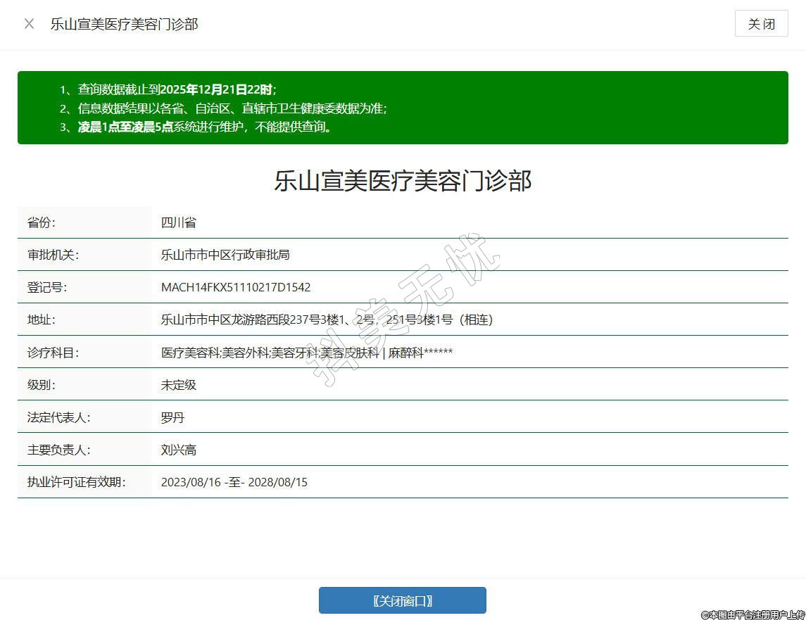 乐山宣美医疗美容门诊部成立于2023年,位于四川省乐山市市中区龙游路西段237号3楼1、2号,251号3楼1号(相连),是宣之美医疗旗下合规机构,持有相关行政许可及麻醉药品使用资质,依法开展医疗美容服务,开设皮肤管理、面部抗衰等合规服务项目,汇聚具备美容主诊备案资质的专业医师团队,遵循医疗美容服务规范,配备适配诊疗需求的设施与环境,以标准化流程保障服务质量,注重医患沟通与隐私保护。