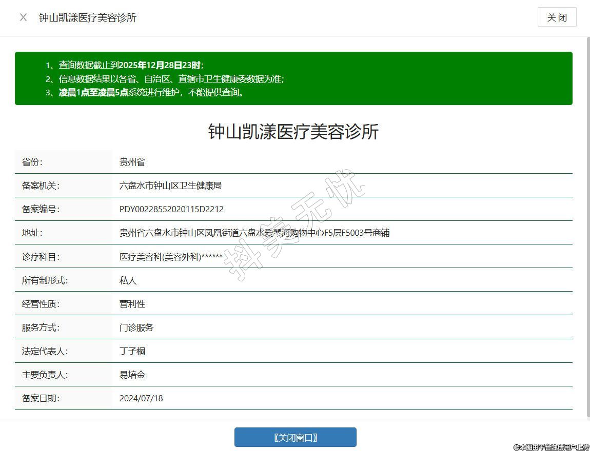 钟山凯漾医疗美容诊所成立于2024年,位于贵州省六盘水市钟山区凤凰街道六盘水爱琴海购物中心F5层F5003号商铺,是经卫生健康行政部门备案的合规医疗美容机构,持有相关执业资质,专注于提供规范的医疗美容服务,汇聚具备国家认可执业资格的专业医护团队,服务涵盖美容皮肤科、微整形等合规项目。