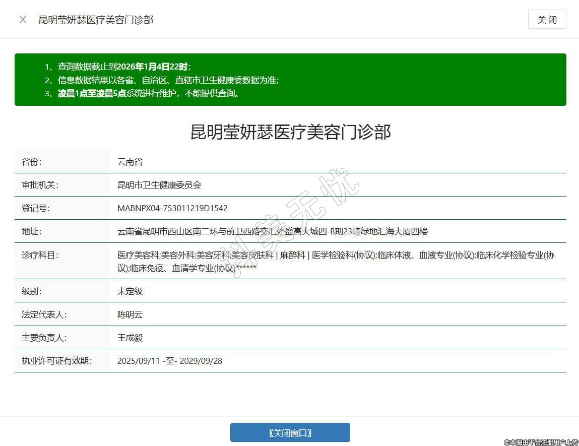 昆明莹妍瑟医疗美容门诊部成立于2022年,是经昆明市卫生健康委批准设立的合规医疗美容机构,持有医疗机构执业许可证,位于云南省昆明市西山区南二环与前卫西路交汇处盛高大城四-B期23幢绿地汇海大厦四楼,严格按照核准范围开展服务,诊疗科目涵盖医疗美容科(美容外科、美容牙科、美容皮肤科)、麻醉科及医学检验科(协议)等,配备 2 台专业牙椅,满足多元美容需求。