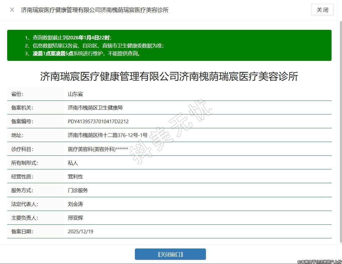 济南瑞宸医疗美容诊所成立于2025年,位于山东省济南市槐荫区振兴街街道纬十二路376-12号-1号(一址多照),是经相关部门批准设立的正规医疗美容机构,持有合法行政许可资质,依法开展医疗美容服务,业务范围涵盖医疗美容服务、药品零售及相关合规辅助服务,诊疗环节遵循规范流程,术前充分沟通告知,术中严守医疗操作标准,术后提供专业护理指导。