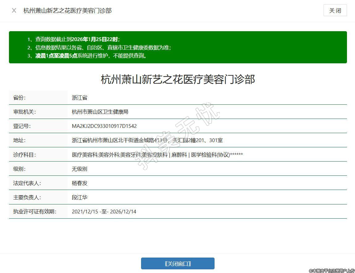 杭州新艺之花医疗美容门诊部成立于2021年,位于浙江省杭州市萧山区北干街道金城路413号,天汇园2幢201、301室,是取得正规医疗机构执业许可的医美机构,获批美容外科、美容牙科、美容皮肤科、麻醉科等诊疗科目,同时合规开展生活美容服务,医师团队均拥有丰富临床经验,秉持精细、微创的诊疗理念,致力于打造专业、安心的医美体验。