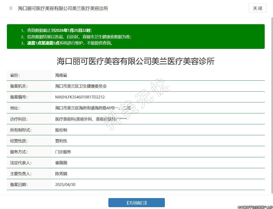 海口丽可医疗美容诊所成立于2025年,位于海口市美兰区海府街道海府路48号一、二层,是经相关部门核准设立的正规医美机构,合规开展医疗美容、生活美容等相关服务,秉持正品化、透明化经营理念,一客一码扫码验真,仪器设备均为正品且相关合格证明公示,配备专业医护与服务团队,遵循海南医美项目分级管理规范开展诊疗,为求美者提供合规、安心的医美服务体验。