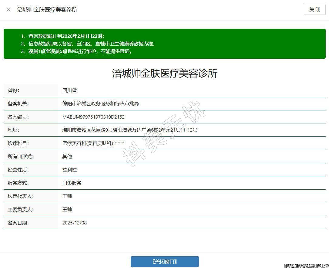 绵阳帅金肤医疗美容诊所创办于2022年,坐落于绵阳市涪城区花园路9号绵阳涪城万达广场6栋2单元21层11-12号,目前处于稳定存续经营状态。诊所拥有合法经营资质,可开展医疗美容、生活美容服务,提供皮肤年轻化、注射抗衰、眼周美容等医美项目