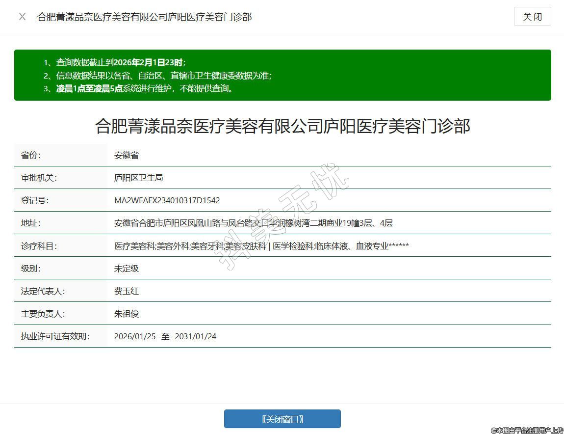 合肥品奈医疗美容门诊部成立于2020年,位于安徽省合肥市庐阳区凤凰山路与凤台路交口华润橡树湾二期商业19幢3层、4层,是经合肥市庐阳区卫健委批准设立的正规医疗美容机构,持有正规《医疗机构执业许可证》,开设美容外科、美容皮肤科、麻醉科、医学检验科等合规诊疗科目,组建了经验丰富的医师团队,深耕问题性肌肤治疗、抗衰抗初老、微整形及整形外科等领域,打造多维度医美服务体系。