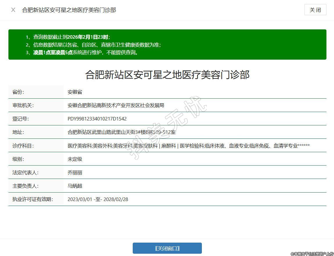 合肥安可星之地医疗美容门诊部成立于2011年,位于安徽省合肥市新站区武里山路武里山天街3#楼B栋509-512室,是经卫生行政部门审核批准、依法校验合格的正规医疗美容机构,开设医疗美容科、美容外科、美容牙科、美容皮肤科、麻醉科、医学检验科等规范诊疗科目,配备经验丰富的医疗团队与标准化诊疗环境,专注为求美者提供安全、专业、舒适的医美服务。