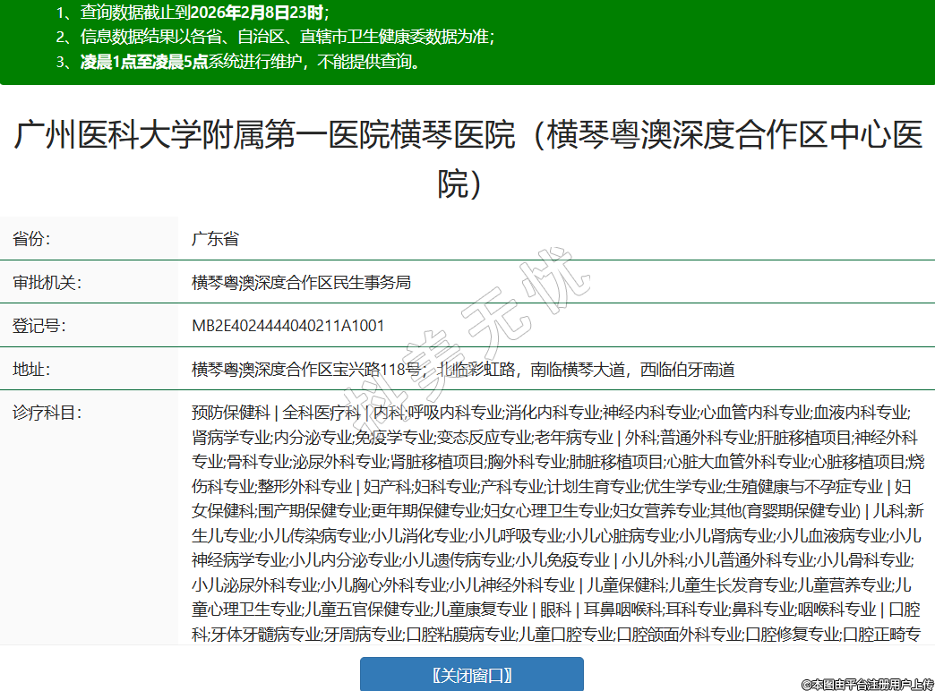 省份:广东省审批机关:横琴粤澳深度合作区民生事务局登记号:MB2E4024444040211A1001地址:横琴粤澳深度合作区宝兴路118号;北临彩虹路,南临横琴大道,西临伯牙南道诊疗科目:预防保健科 | 全科医疗科 | 内科;呼吸内科专业;消化内科专业;神经内科专业;心血管内科专业;血液内科专业;肾病学专业;内分泌专业;免疫学专业;变态反应专业;老年病专业 | 外科;普通外科专业;肝脏移植项目;神经外科专业;骨科专业;泌尿外科专业;肾脏移植项目;胸外科专业;肺脏移植项目;心脏大血管外科专业;心脏移植项目;烧伤科专业;整形外科专业 | 妇产科;妇科专业;产科专业;计划生育专业;优生学专业;生殖健康与不孕症专业 | 妇女保健科;围产期保健专业;更年期保健专业;妇女心理卫生专业;妇女营养专业;其他(育婴期保健专业) | 儿科;新生儿专业;小儿传染病专业;小儿消化专业;小儿呼吸专业;小儿心脏病专业;小儿肾病专业;小儿血液病专业;小儿神经病学专业;小儿内分泌专业;小儿遗传病专业;小儿免疫专业 | 小儿外科;小儿普通外科专业;小儿骨科专业;小儿泌尿外科专业;小儿胸心外科专业;小儿神经外科专业 | 儿童保健科;儿童生长发育专业;儿童营养专业;儿童心理卫生专业;儿童五官保健专业;儿童康复专业 | 眼科 | 耳鼻咽喉科;耳科专业;鼻科专业;咽喉科专业 | 口腔科;牙体牙髓病专业;牙周病专业;口腔粘膜病专业;儿童口腔专业;口腔颌面外科专业;口腔修复专业;口腔正畸专业;口腔种植专业;口腔麻醉专业;口腔颌面医学影像专业;口腔病理专业;预防口腔专业;其他(口腔内科专业) | 皮肤科;皮肤病专业;性传播疾病专业 | 医疗美容科;美容外科;美容牙科;美容皮肤科;美容中医科;医疗美容心理诊断及辅导;美容医疗应用技术 | 精神科;精神病专业;精神卫生专业;精神康复专业;社区防治专业;临床心理专业;司法精神专业 | 传染科;肠道传染病专业;呼吸道传染病专业;肝炎专业;虫媒传染病专业;动物源性传染病专业;蠕虫病专业 | 肿瘤科 | 急诊医学科 | 康复医学科 | 麻醉科 | 疼痛科 | 重症医学科 | 医学检验科;临床体液、血液专业;临床微生物学专业;临床化学检验专业;临床免疫、血清学专业;临床细胞分子遗传学专业 | 病理科 | 医学影像科;X线诊断专业;CT诊断专业;磁共振成像诊断专业;核医学专业;超声诊断专业;心电诊断专业;脑电及脑血流图诊断专业;神经肌肉电图专业;介入放射学专业;放射治疗专业 | 中医科;内科专业;外科专业;妇产科专业;儿科专业;皮肤科专业;眼科专业;耳鼻咽喉科专业;口腔科专业;肿瘤科专业;骨伤科专业;肛肠科专业;老年病科专业;针灸科专业;推拿科专业;康复医学专业;急诊科专业 | 中西医结合科******级别:三级法定代表人:黄锦坤主要负责人:黄锦坤执业许可证有效期:2023/01/05 -至- 2038/01/05 -