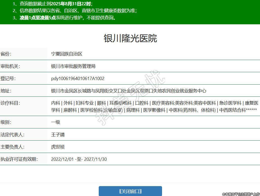 省份:宁夏回族自治区审批机关:银川市审批服务管理局登记号:pdy10061964010617A1002地址:银川市金凤区长城路与凤翔街交叉口处金凤区双渠口失地农民创业就业服务中心诊疗科目:内科 | 外科 | 妇科专业 | 眼科 | 耳鼻咽喉科 | 口腔科 | 医疗美容科;美容外科;美容中医科 | 急诊医学科 | 康复医学科 | 麻醉科 | 医学检验科(含输血室) | 病理科 | 医学影像科 | 中医科(药剂科、体检科) | 中西医结合科******级别:一级法定代表人:王子靖主要负责人:虎世祯执业许可证有效期:2022/12/01 -至- 2027/11/30 -