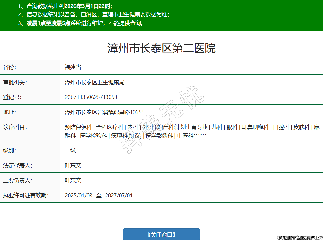 省份:福建省审批机关:漳州市长泰区卫生健康局登记号:226711350625713053地址:漳州市长泰区岩溪镇锦昌路106号诊疗科目:预防保健科 | 全科医疗科 | 内科 | 外科 | 妇产科;计划生育专业 | 儿科 | 眼科 | 耳鼻咽喉科 | 口腔科 | 皮肤科 | 麻醉科 | 医学检验科 | 病理科(协议) | 医学影像科 | 中医科******级别:一级法定代表人:叶东文主要负责人:叶东文执业许可证有效期:2025/01/03 -至- 2027/07/01 -