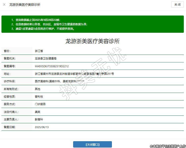 龙游浙美医疗美容诊所有限公司成立于2025年05月12日,注册地位于浙江省衢州市龙游县龙洲街道华都首府公寓香滨园7幢兰亭路291号,法定代表人为龚英。经营范围包括许可项目:医疗美容服务;生活美容服务;医疗服务(依法须经批准的项目,经相关部门批准后方可开展经营活动,具体经营项目以审批结果为准)。