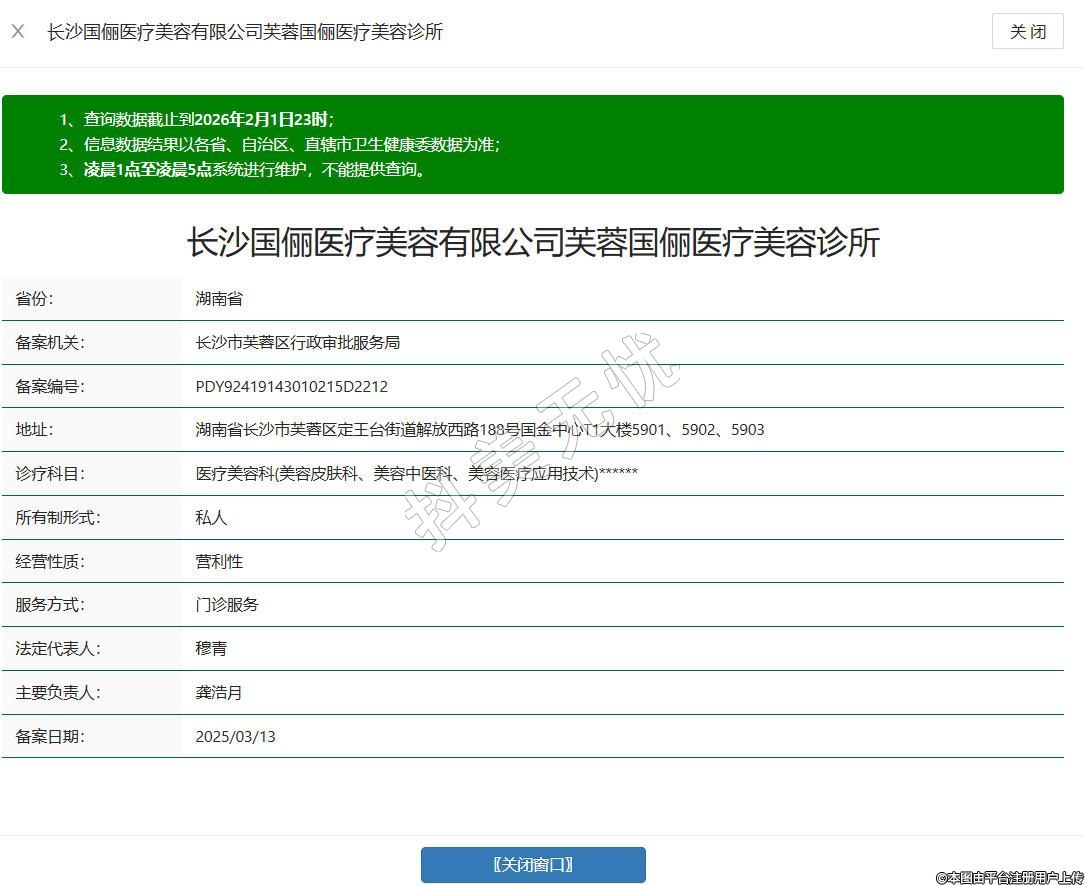 长沙国俪医疗美容诊所于2024年成立,位于长沙市芙蓉区定王台街道解放西路188号国金中心T1塔楼5901、5902、5903,是合规备案的医疗美容服务机构。