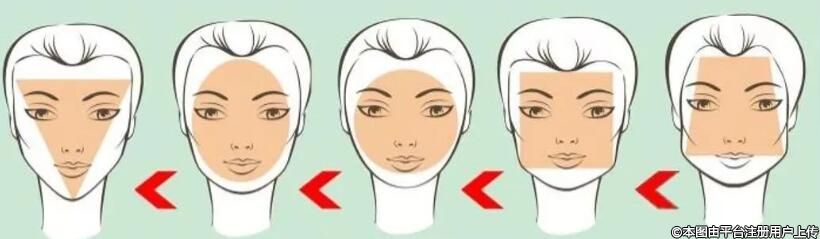 瓜子、鹅蛋、圆、方形、梨形脸,从左往右,脸看起来越来越大。