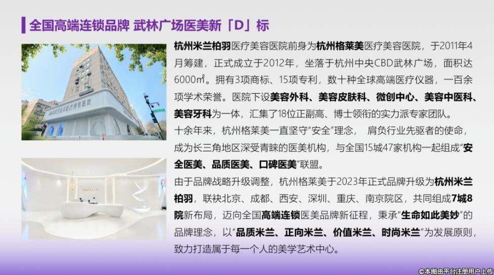 感谢您一直以来对杭州格莱美的信任和支持为给您提供更优质的服务和更优雅的变美享受原杭州格莱美医疗美容医院品牌全面升级为杭州米兰柏羽医疗美容医院与四川米兰柏羽总院、成都高新米兰柏羽、西安米兰柏羽深圳米兰柏羽共同形成全国连锁高端品质医美新布局品牌升级工作为本院品牌战略调整您在本院的消费记录、未治疗项目、积分等均不受影响为您服务的咨询团队、医生团队亦无变动。