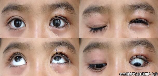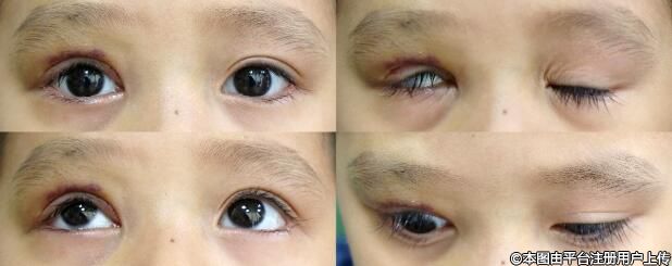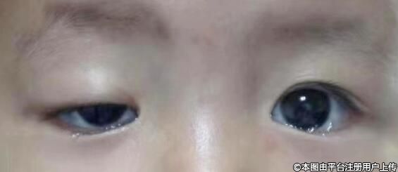 出生后出现单眼或双眼睁不大,眼睛表现为黑眼珠露出不足,甚至完全不能睁眼,单侧发病者表现“大小眼”,双侧下垂常有仰头、抬眉、皱额的特殊姿势。先天性上睑下垂影响外观,严重者可影响视力发育形成弱视,不利于患儿心理发育。程度分级:轻度(上睑遮盖瞳孔1/3);中度(上睑遮盖瞳孔1/2);重度(上睑遮盖瞳孔2/3)。