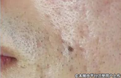 深箱车型痘坑:看起来皮肤表面缺失了一块,坑的边缘近乎垂直陡峭,坑底平缓。