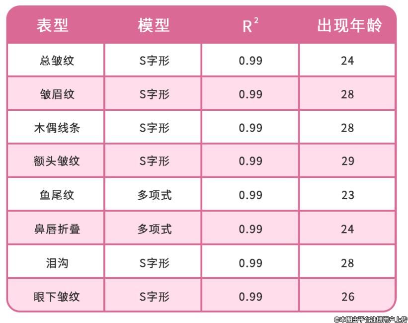 研究测试了脸部常见的7种皱纹,总皱纹的出现时间为24岁,其中与微笑表达相关的皱纹出现比较早,比如鱼尾纹和法令纹。与愤怒或悲伤相关的皱纹,如皱眉纹、木偶纹往往发生在30岁左右。