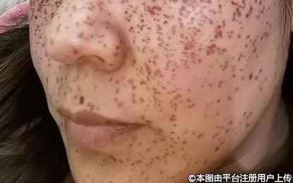 1、雀斑:分布鼻子和脸颊,数量多,个头小棕褐色的点状色素沉着斑点。主要是遗传原因导致,比较难根除,不注意防晒还会加重雀斑。