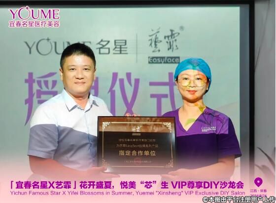 沙龙现场,艺霏品牌方代表徐总上台授牌,授权宜春名星医疗美容为艺霏Easyface品牌系列产品指定合作单位,作为“三正规·放心美”医美机构,坚持“正规机构、正规医生、正规产品”,以诚信经营、高质服务、高性价比的经营理念,为当地医美消费者带来放心安全的变美体验。