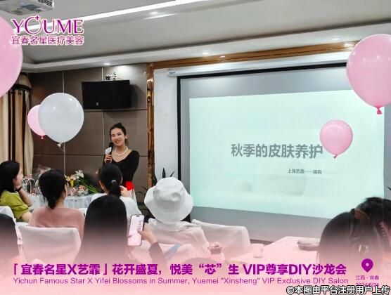 随后,艺霏品牌方——胡莉老师上台为我们分享《秋季的皮肤养护》。她还表示:“在忙碌的生活中,运动、冥想、阅读、感恩,确实是我们自我疗愈很好的方法。除此之外呢,美肤也是一种提升幸福感的方式。作为深耕皮肤领域十多年的民族品牌,艺霏一直专注于肌肤健康美学研究,不断夯实抗氧化地位。相信宜春名星与艺霏的强强携手,能更好改善临床中遇到的【敏炎斑衰】等皮肤问题,提升顾客的皮肤美容满意度。”