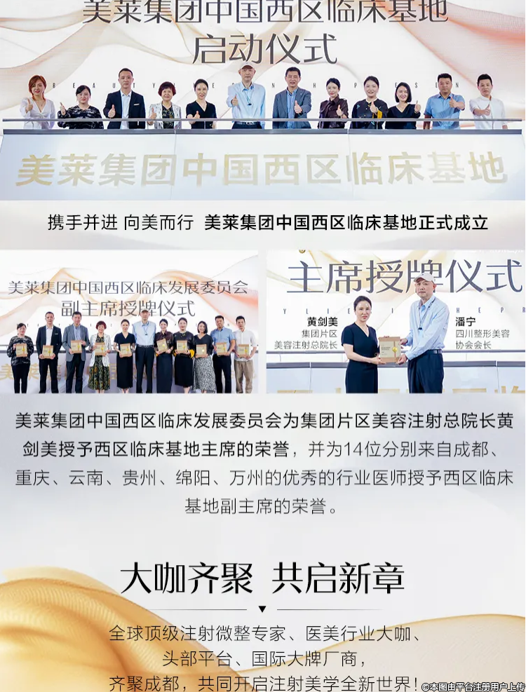 美莱集团中国西区临床发展委员会为集团片区美容注射总院长黄剑美授予西区临床基地主席的荣誉,并为14位分别来自成都、重庆、云南、贵州、绵阳、万州的优秀的行业医师授予西区临床基地副主席的荣誉。