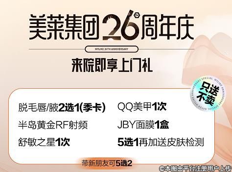 武汉美莱26周年庆优惠福利来啦,带朋友到院,即可享受美肤福利,五大福利可免费选择其中两个,你还在等什么呢。