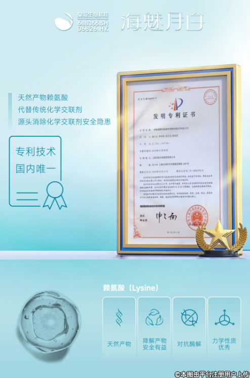 昊海生科自主研发,全球首创有机交联工艺,海魅月白玻尿酸创新使用天然产物赖氨酸(人体必需氨基酸)为交联剂,相较于传统化学交联剂安全性高。该玻尿酸为国内首个封闭透明质酸酶作用位点产品,具有更为长效的特质。